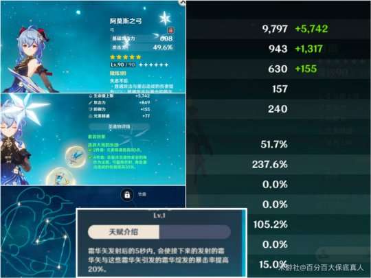 甘雨零命,武器阿莫斯(专武),攻击力2260,双爆51.7%(被动天赋加20%暴击率,可视为70%暴击率),237.6%;圣遗物是流浪大地。