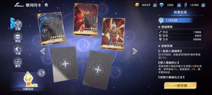 以上闪卡并非固定搭配,比如上阵欧布或ur强壮日冕赛罗可以携带【超力量战士-金】,提高必杀技伤害可携带【斗志燃烧的战士-紫】,缺少能量可携带【雷电的掌控者-蓝】、【闻名宇宙的剑技-紫】、【身手敏捷的战士-金】等。