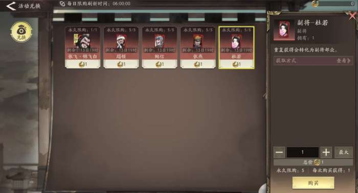 该活动商店的鲍信、张燕、杜若均可在副将寻访中正常招募、刷片,兑换这3个性价比不高。