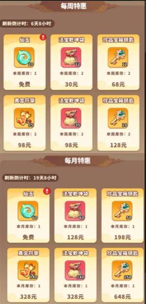 1、特惠商城:每日特惠、每周特惠、每月特惠,三个商城一个月下来可以白嫖5*30+20*4+60=290仙玉