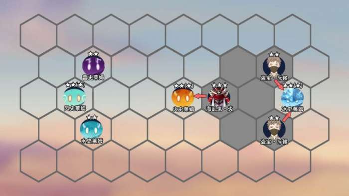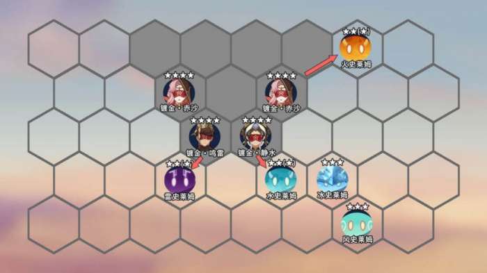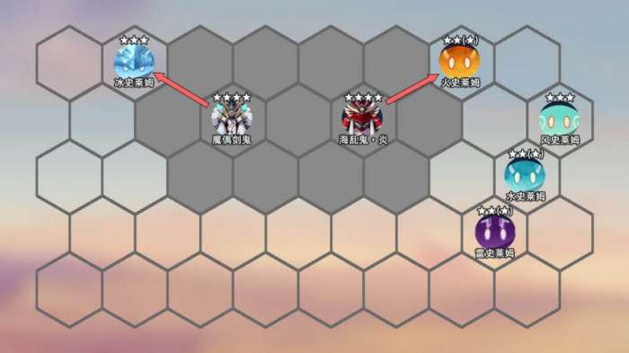 ●关卡3-2危机遭遇战:大规模搜卡,如果没有【负载的转化】,则应该优先确保冰史莱姆升★★★(可以借助复刻器),风/火史莱姆择机升★★★。站位方面,由火史莱姆吸引海乱鬼仇恨,冰史莱姆吸引盗宝团仇恨: