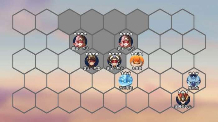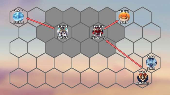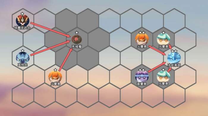 ●关卡3-2危机遭遇战:大规模搜卡,优先争取绒翼龙武士升★★★(可以借助复刻器),同时给冥视龙、火蕈兽的★★★做储备。站位如下: