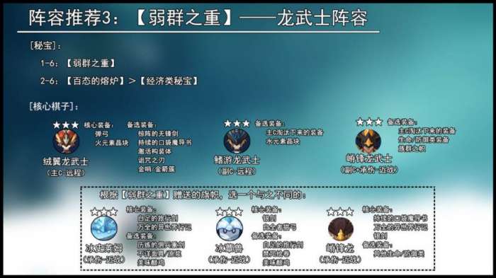 ●龙武士阵容。核心秘宝【弱群之重】,特点是既有输出,又有生存。借助混搭族群特性,大幅改善龙武士的生存能力。变化多样可玩性极高,但是难度也大,容易翻车。