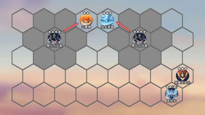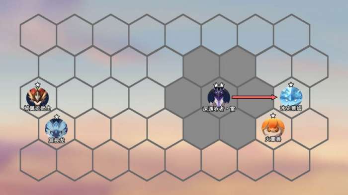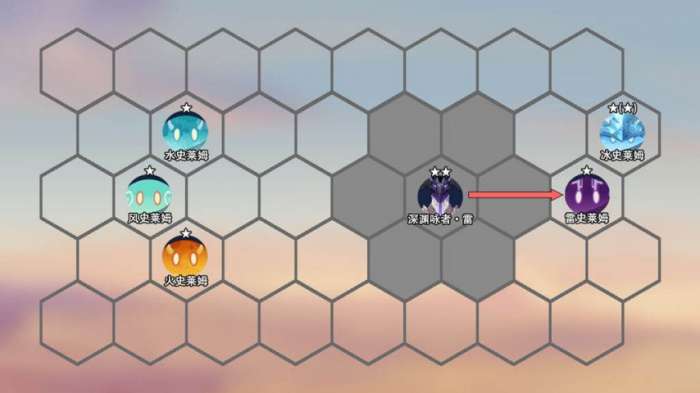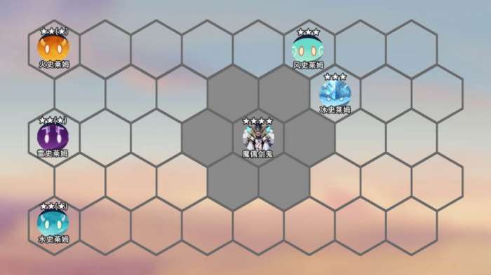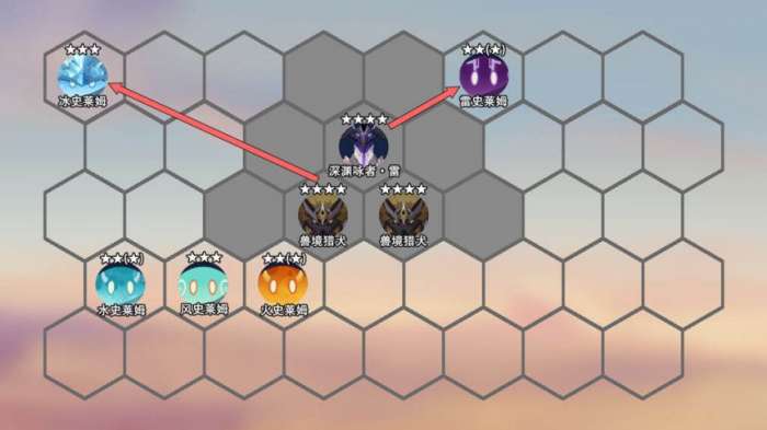 ●关卡1-10 Boss战:★★深渊咏者·雷×1。战斗之前,利用棋子商店的免费刷新次数,集齐4个核心棋子。将其他无关棋子卖掉,有条件可以优先将冰史莱姆升至★★。站位如下: