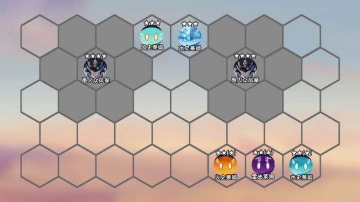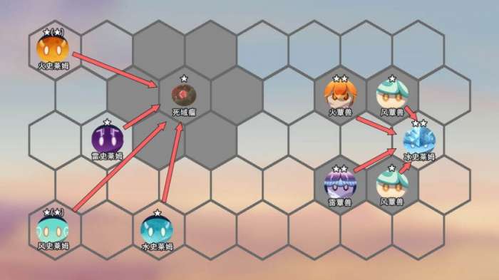 如果没有【负载的转化】,战斗之前强烈建议将冰史莱姆升至★★确保能抗住蕈兽的攻击;有余力可以优先将风/火史莱姆升★★。站位如下: