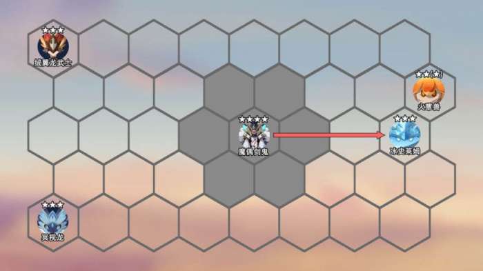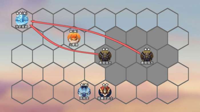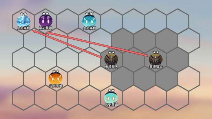 注意:流血狗会优先锁定距离最远的棋子,要将冰史莱姆放在最远位置: