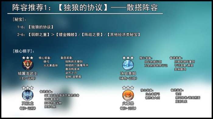 ●散搭阵容。核心秘宝【独狼的协议】,特点是综合实力优秀。可以选择各阵营中最优秀的棋子,集百家之长,各种装备都能高效利用。玩起来很爽。