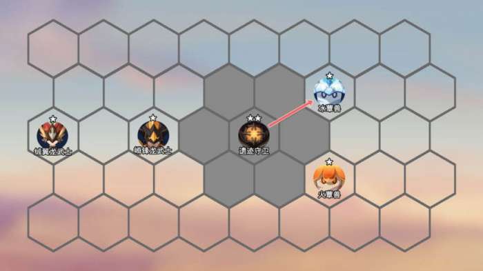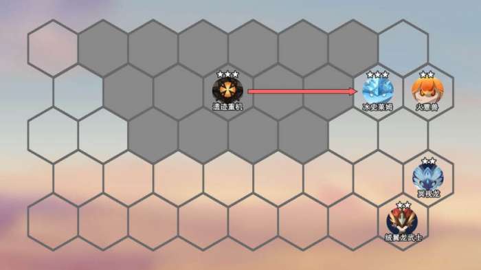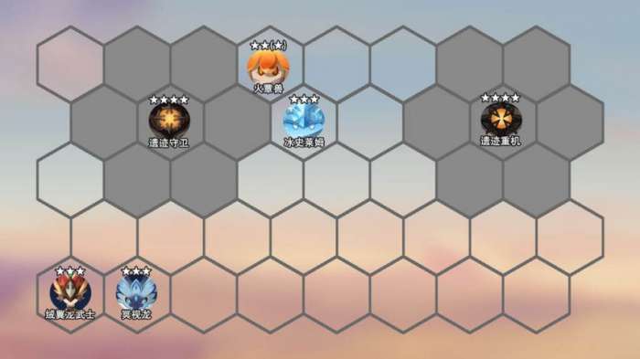 ●关卡1-6的战斗只有一个遗迹守卫。将远程棋子靠边,近战棋子紧贴守卫吸引仇恨即可: