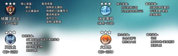 ●关卡2-10 Boss战:至少全员★★以上(可以使用复刻器补足),冰史莱姆★★★;如果条件允许,可以提前购买绒翼龙武士,准备升★★★。 推荐站位: