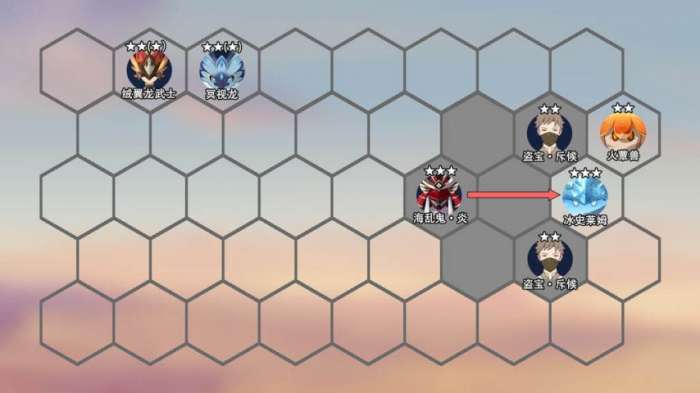 ●关卡2-6危机遭遇战:建议全员★★;流血狗会优先锁定距离最远的棋子,要将冰史莱姆放在最远位置:
