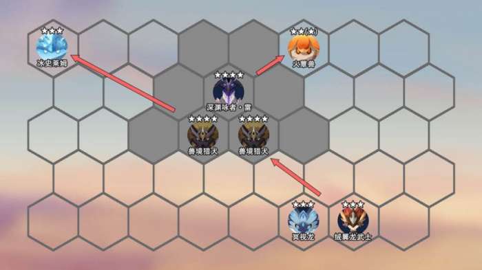 另外留意一下装备,绝大多数装备应为稀有级以上,并且绒翼龙武士、冥视龙至少拥有1件核心装备。如果装备达标,可以留10~20金币,否则应多留一些金币(20~30)。站位如下: