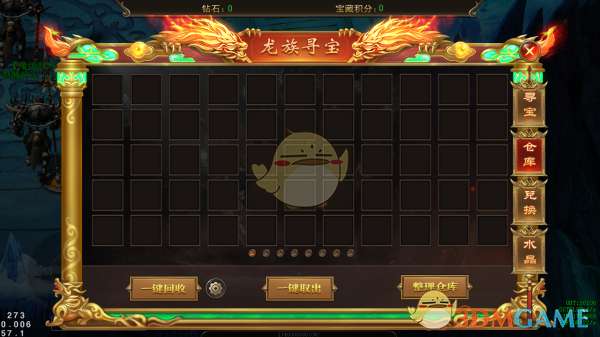 (2)宝藏仓库:所有的寻宝和夺宝获得的装备和道具都会保存在仓库里,可以一键回收低等级的装备,高等级的装备或道具可以一键提取到背包。