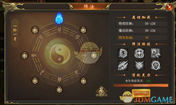 阵法系统分为8阶,每阶10星,提升阵法属性可以获得攻击加成属性提升,阵法等级越高获得的攻击加成就越高,同时也会获得特殊技能。