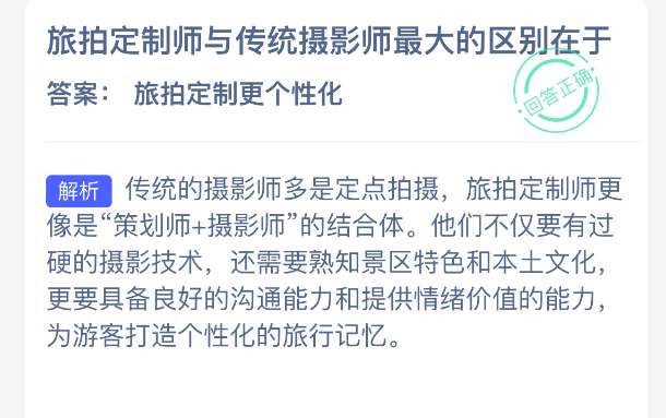 旅拍定制师与传统摄影师最大的区别在于?【蚂蚁新村每日一题】2025年12月5日题目已发布!坚持答题,积累木兰币,即可加速小镇建设。答对本题,立即可享“产速+3/时”的加速奖励!今天正确答案是【旅拍定制更个性化】。旅拍定制师与传统摄影师最大的区别在于旅拍定制更个性化。