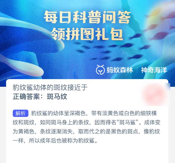 豹纹鲨幼体的斑纹接近于?支付宝蚂蚁森林神奇海洋2025年7月24日问题已经更新,今日正确答案是:【斑马纹】。豹纹鲨的幼体呈深褐色,带有淡黄色或白色的细狭横纹和斑纹,如同斑马身上的条纹,因而得名“斑马鲨”。