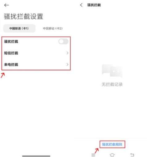 4、进入后开启骚扰拦截的开关,自定义短信拦截和来电拦截的规则即可。