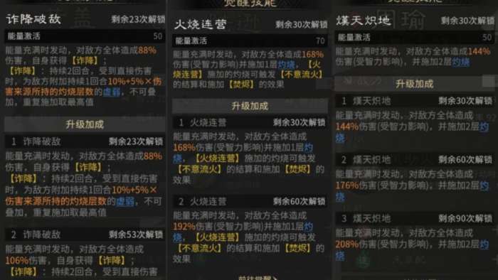 觉醒技能【诈降破敌】对敌方全体造成伤害,自身获得【诈降】状态;受到直接伤害后,将根据敌方目标身上的【灼烧】层数施加【虚弱】状态,【灼烧】层数越高【虚弱】效果越强,从而有效降低敌方造成的伤害。