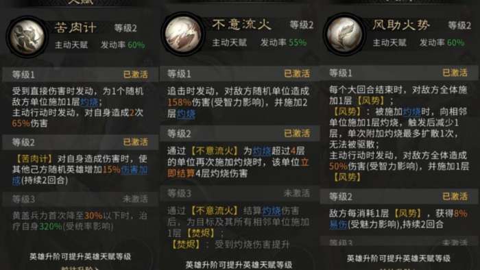 黄盖天赋【苦肉计】会对自身造成两次伤害,并为随机友方英雄提供伤害加成。受到直接伤害后,还能为随机敌方单位施加【灼烧】效果。