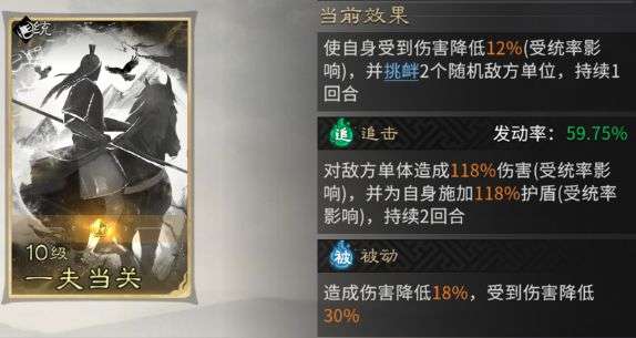 被动技能固定携带【一夫当关】,在降低自身造成伤害的同时,也使自身受到的伤害降低,能够很好地承担前排肉盾的角色。该技能还可与自身天赋【苦肉计】形成搭配,降低【苦肉计】对自身造成的伤害以及自身受到的伤害,从而有效保障自身血量健康,持续为队友提供伤害增益,并为敌方施加灼烧效果。