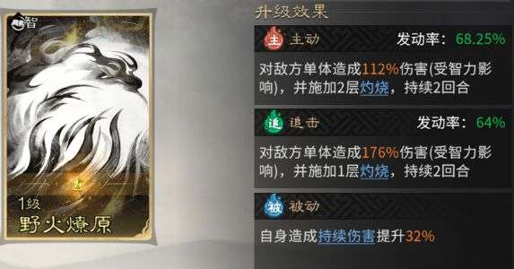 陆逊的追击技能固定携带【野火燎原】,在造成高额伤害的同时附加灼烧效果。由于陆逊站双追击位,可多次发动该技能,其出色的爆发能力与【灼烧】效果,配合自身天赋,能显著提升队伍的整体强度。