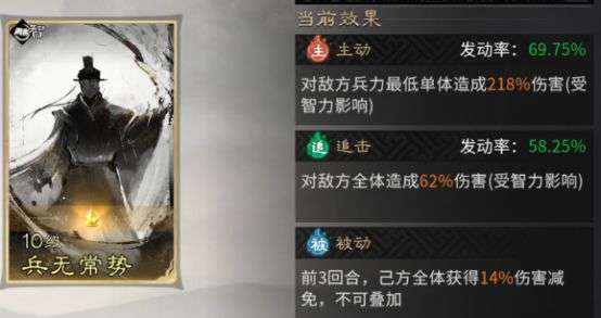 周瑜的被动技能固定携带【兵无常势】,前3回合己方可获得伤害减免。对于缺乏标准肉盾保护和辅助治疗的火烧队伍而言,此技能可以显著提升我方容错率,有效防止被秒杀的情况。