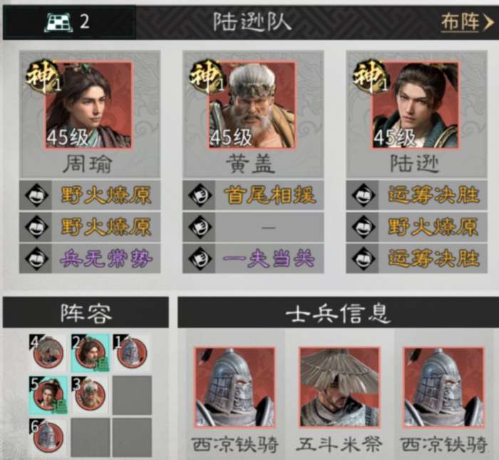 兵种站位:在周瑜的前方放置一个西凉铁骑,在周瑜的后方放置一个五斗米祭,在陆逊的下方放置一个西凉铁骑。