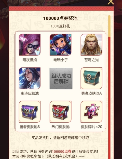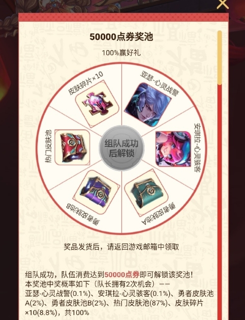 队内累计消费50000点券奖池可抽到亚瑟的心灵战警和安琪拉的心灵骇客皮肤;队内累计消费100000点券奖池可抽电玩小子等皮肤,还有史诗皮肤池等待解锁。