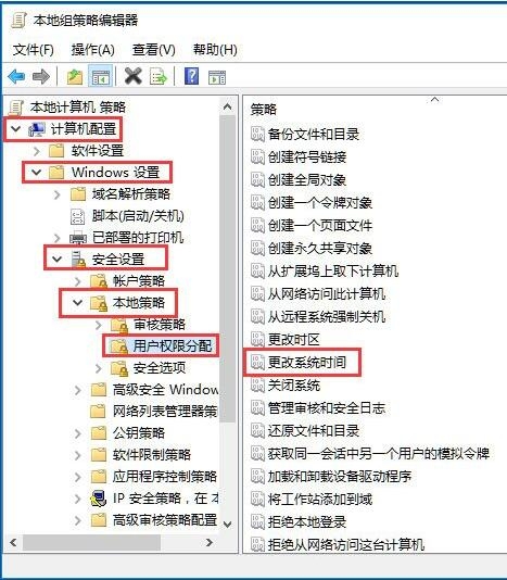 2、弹出本地组策略编辑器,点击计算机配置→Windows设置→安全设置→本地策略→用户权限分配,找到右边的“更改系统时间”并双击;