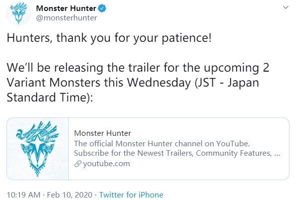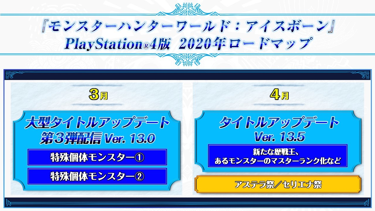 各位猎人大家好,近日《怪物猎人:世界》官方公开了2020年上半年更新路线图,其中曾讲到3月份将有两只特殊怪物在《怪物猎人世界:冰原》的大型更新中登场。原本《怪物猎人》将于台北电玩展公开两只怪物的详细信息,但由于展会延期,两只特殊怪物的宣传片已经确定将于本周三(2月12日)正式放出。