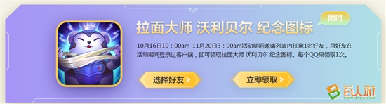 10月16日10:00am-11月20日3:00am活动期间邀请列表内任意1名好友,且好友在活动期间登录过客户端,即可领取拉面大师 沃利贝尔 纪念图标。每个QQ限领取1次。