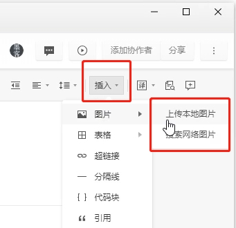 1、如果我们想要在石墨文档中上传图片,就在页面上方工具栏中选择插入,上传本地图片或搜索网络图片。