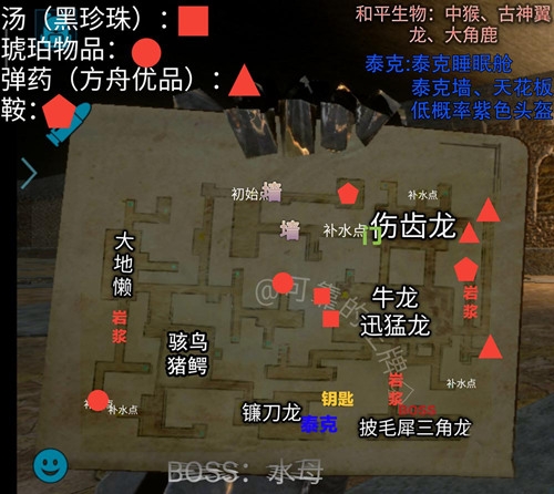 本期“淹溺先驱之巢”地牢通关难度极为残酷,大地懒、骇鸟、猪鳄、镰刀龙、伤齿龙、牛龙、迅猛龙、披毛犀、三角龙等生物都将出现,并且等级均为420级。这其中,大地懒可以借助卡房间内柱子完成击杀,但镰刀龙移动太快相当难缠,需要利用复合弓或霰弹枪放风筝,而伤齿龙则只能拿盾硬抗,很难无伤,过程中少不了服用兴奋剂。另外地牢当中还有和平生物古神翼龙,是手游当中唯一可供三人乘骑的飞行生物,感兴趣的玩家可以去驯服。