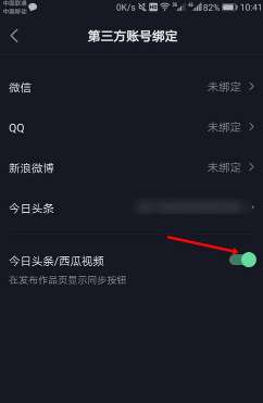 5、进入第三方账号绑定界面,可以看到用户绑定的第三方账号,在页面最下方的位置可以看到今日头条/西瓜视频发布同步选项,将其开启即可将抖音上面的视频同步至抖音火山版,