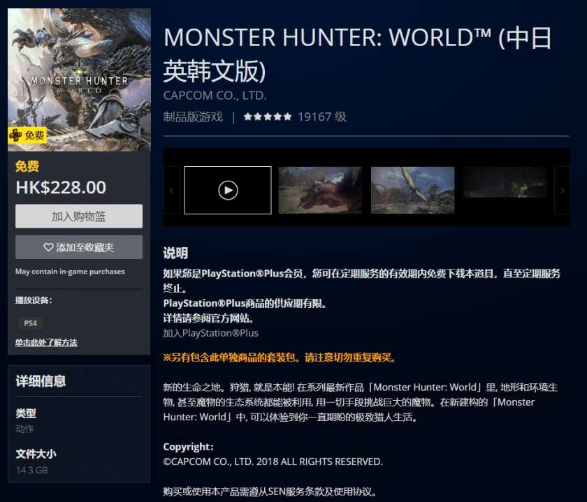 恭喜各位PS+的会员,各位的福利又来了,PlayStation商店现在免费赠送《怪物猎人:世界》的游戏本体,港、日、美都已经上线了,3月18——4月22均可免费领取。什么?已经买了的?早买早享受嘛!
