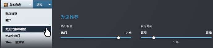您也可以访问 store.steampowered.com/recommender,或是通过您的商店菜单,进入交互式推荐模型。