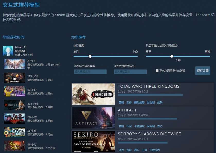 小编也尝试了一下 Steam 新推出的交互式推荐模型,可以看到在左侧 Steam 列出了我近段时间所游玩的游戏以及总游玩时间,并在右边为我推荐了几款游戏,例如《全面战争:三国》、《Artifact》(???)、《只狼:影逝二度》等。除此之外,玩家还可以调整上方的“热门程度”以及“游戏发售时间”,无论你是喜欢老游戏还是冷门游戏该模型都能满足你的要求。