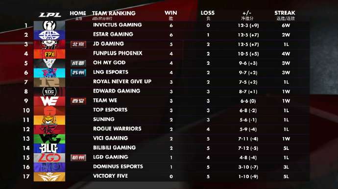 昨日赛果如下:iG在战胜TES后以六连胜的战绩领跑LPL积分榜;ES在战胜BLG后以6-1的战绩排名第二;OMG也在拿下胜利之后积分排名来到了第五。