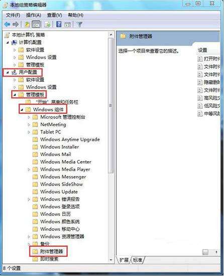 3、一次展开:用户配置-----管理模板---windows组建,在右侧的组件中找到“附件管理器”,双击“附件管理器”。如图所示: