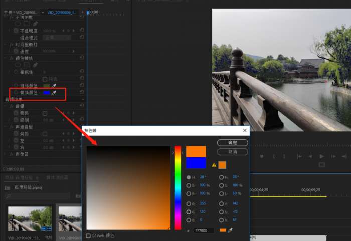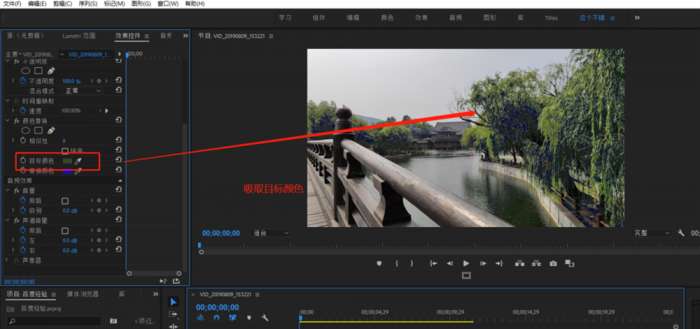 打开【效果控件】,找到颜色替换效果,点击【目标颜色】,用吸管吸取视频画面中需要替换的颜色,