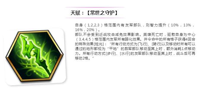 自身(1,2,2,3)格范围内有友军部队,则智力提升(10%,13%,16%,20%)。