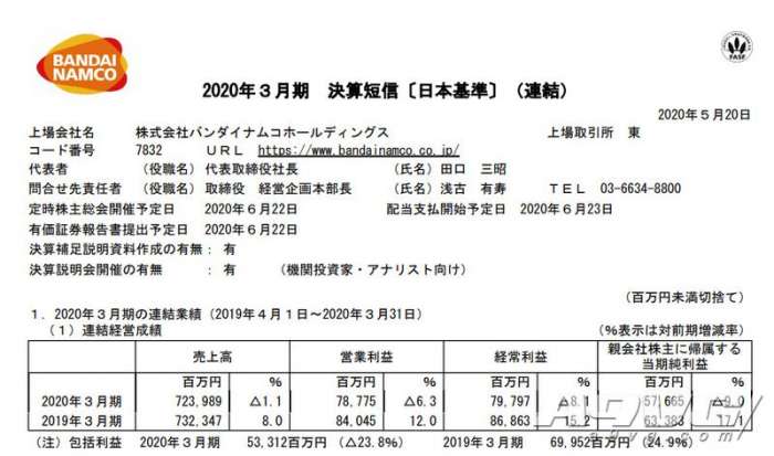 万代南梦宫19-20年度财报 整体减收减益部分部门受新冠影响