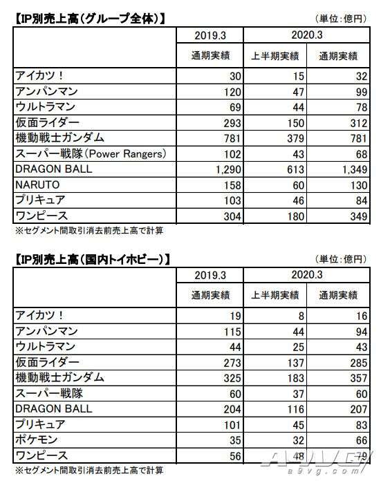 ·集团整体IP营收前五:《龙珠》(1349亿日元)、《机动战士高达》(781亿日元)、《海贼王》(349亿日元)、《假面骑士》(312亿日元)、《火影忍者》(130亿日元)。