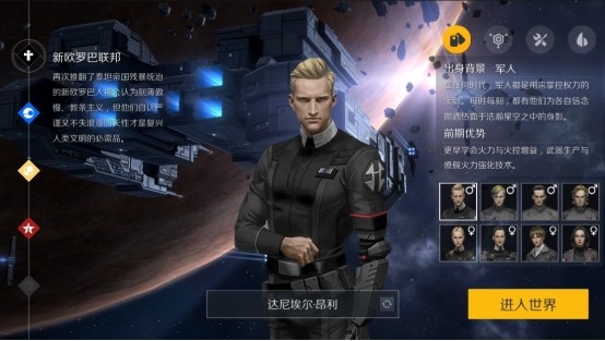 另,除出生国籍外,玩家在创角时还毕需选择角色的出生职业。在游戏中,玩家目前可选的职业包括:军人、工程师、科学家和探险家。和国家选择一样,职业选择带来的区别也仅体现在角色的初期科研技能上:
