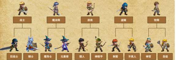 游戏中共有5大基础职业及10个进阶职业,见下图职业树: