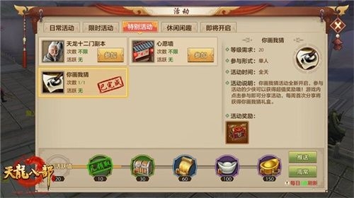 《天龙八部手游》全新活动“你画我猜”面向广大玩家开放中,活动期间,只要玩家的角色等级达到20级,就能在全天任何时间内以单人的形式前来参加活动,不过仅在每周的首次分享时才可以获得奖励。