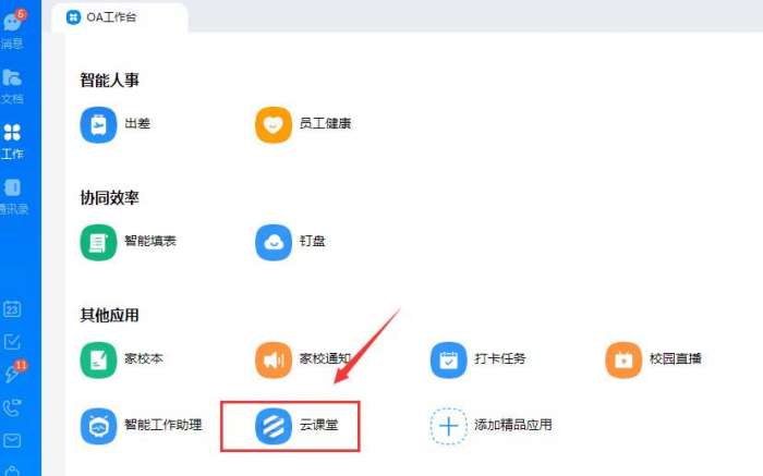 1、打开钉钉的工作区应用选择【云课堂】应用。