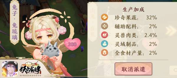 通过餐厅等级的提升,槽位会逐步解锁。选择你需要养殖的料理兽品种,即可进行饲养。不同的妖怪饲养员,拥有不同的属性加成,使用爱吃胡萝卜的兔妖当饲养员,会增加水果蔬菜的产量加成。使用狼妖当饲养员,毫无疑问,羊肉产量会大幅增加。