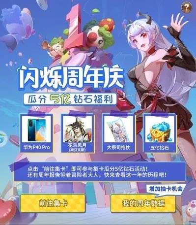 (1)通过游戏内【限时活动】-【周年庆典】活动入口,前往H5抽奖页面集卡,集卡成功可在最后一天参与瓜分5亿钻石活动,更有华为P40pro、大祭司等身抱枕和珍稀道具等你来抽!