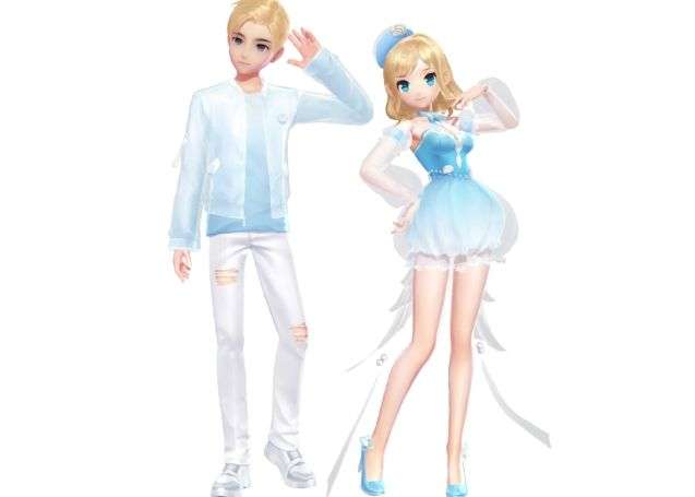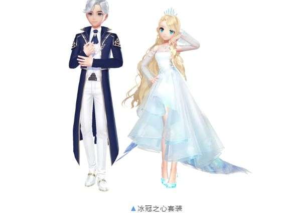男装深蓝色燕尾服展现别具一格的绅士气息;女装浅蓝色长裙清冷优雅,薄纱覆盖,朦胧似幻,雪花点缀,如冬日里的精灵。
