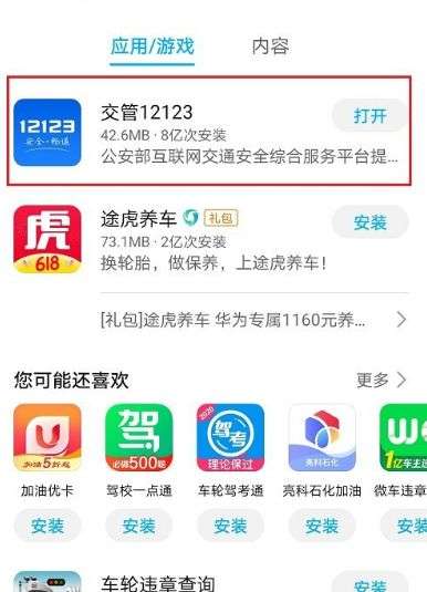第二步进去应用市场之后,搜索交管12123,点击进行安装,如下图所示:
